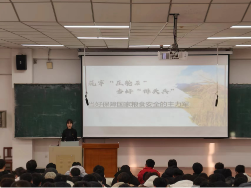 宣讲团成员高冉同学以《筑牢“压舱石”,当好“排头兵”》为主题展开宣讲,以“振兴东北,粮食不可或缺”的角度强调粮食安全的重要性。她提到,身为龙江子弟,要肩负起保障国家粮食安全的“主力军”的使命与责任,以实际行动践行青年担当。