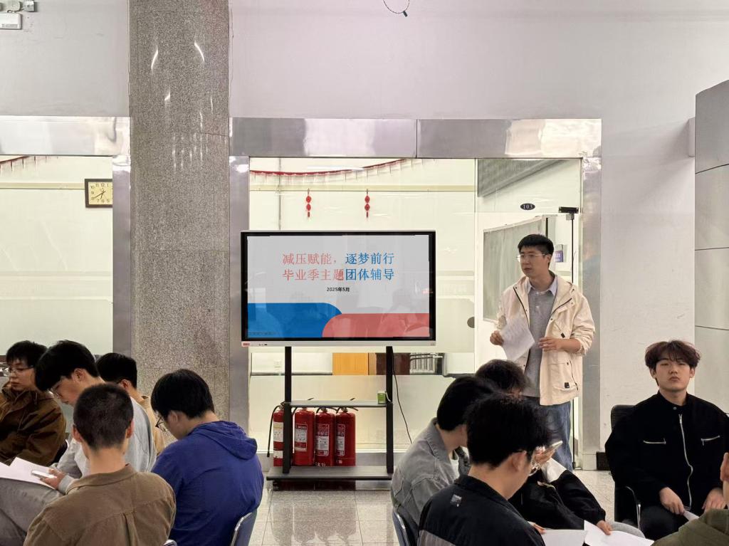 为进一步加强对公司2025届毕业生的人文关怀和心理疏导,提升毕业生的心理调适能力,增强心理韧性,切实保障毕业生安全离校、文明离校、和谐离校,公司于5月15日18:30在公司一楼大厅开展“减压赋能·逐梦前行”2025届毕业生团体心理辅导活动,本次活动由2025届本科毕业生辅导员栾义豪主持。