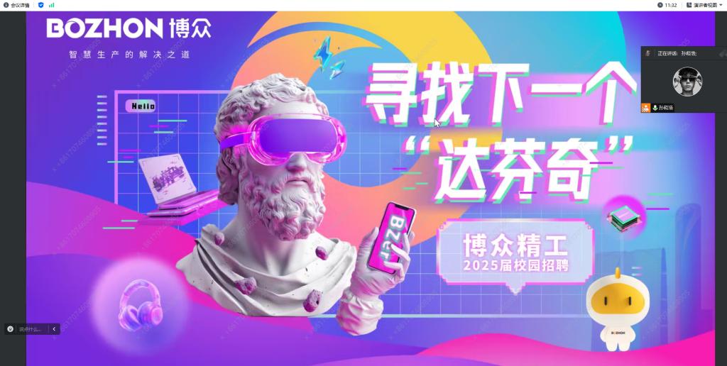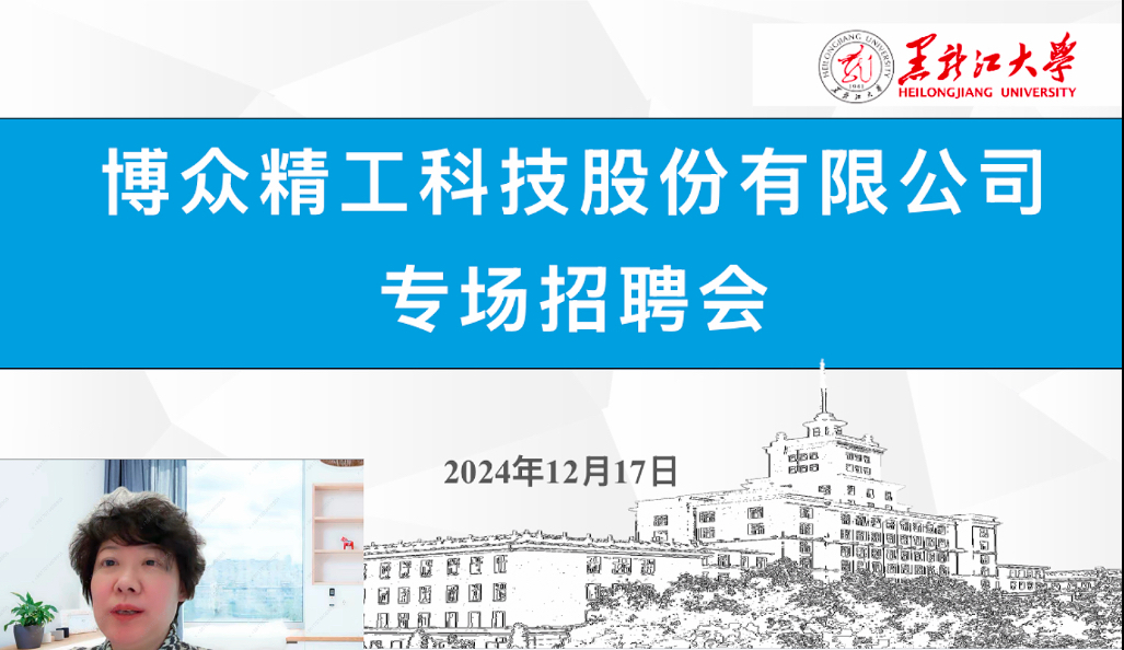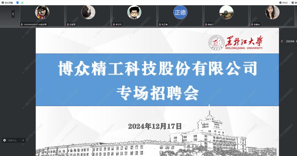 为切实做好毕业生就业工作,拓宽就业渠道,精准搭建企业与员工双向选择的互动平台,助推公司2025届毕业生高质量就业,永利yl联合电子工程公司、外国语言文学公司于12月17日晚18:30在腾讯会议举办博众精工科技股份有限公司专场招聘会,公司党委副书记杨宁宁、电子工程公司党委副书记李云风、外国语言文学公司党委副书记邓洪健以及来自各个公司不同年级的研究生和本科生共计60余人参加会议,会议由2025届本科毕业生辅导员栾义豪主持。