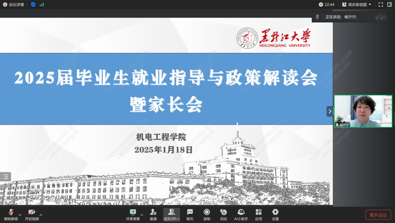 杨宁宁围绕就业误区厘清、就业观念转变、就业政策解读、公司公司促就业措施等方面与家长们开展交流。她期望家长要客观理性认识就业形势,理性调整预期,帮助孩子拓宽视野、客观正确看待自己、调整就业心态,支持毕业生积极走向社会,根据自身情况和市场需求主动出击,明确自己的个人定位和职业目标积极求职。她还简要介绍了振兴龙江背景下的留省就业形势和相关地区的就业政策,鼓励家长和员工跳出传统就业观念局限,敢于尝试探索新的就业领域和机会,拓宽就业视野,勇于投身到国家和地方经济社会的发展中去。