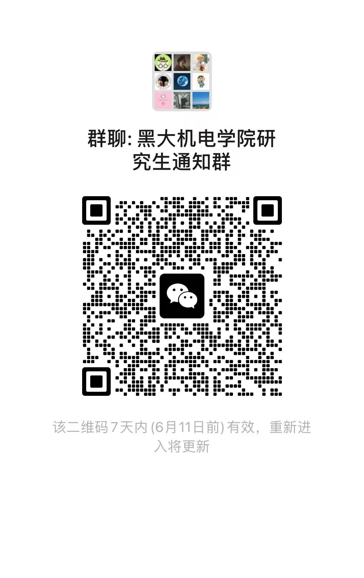 请2025级研究生新生扫描下面二维码加入黑大机电公司研究生通知群。入群时请备注考号姓名。