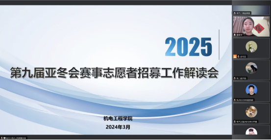面试选拔前期,公司通过腾讯会议开展第九届亚冬会赛事志愿者招募工作解读会。姜俊羊围绕亚冬会概况、志愿服务培训工作时间安排、志愿者工作职责等方面进行介绍,通过线上互动的方式,为参会员工深入浅出地讲解如何做好亚冬会志愿服务工作。张璐在解读会中总结到,亚冬会志愿者工作是一次能够增长见识和丰富阅历的宝贵机会,如有幸入选,希望同学们能够充分发挥自身的专业技能和优势,为亚冬会的顺利召开贡献青春力量。